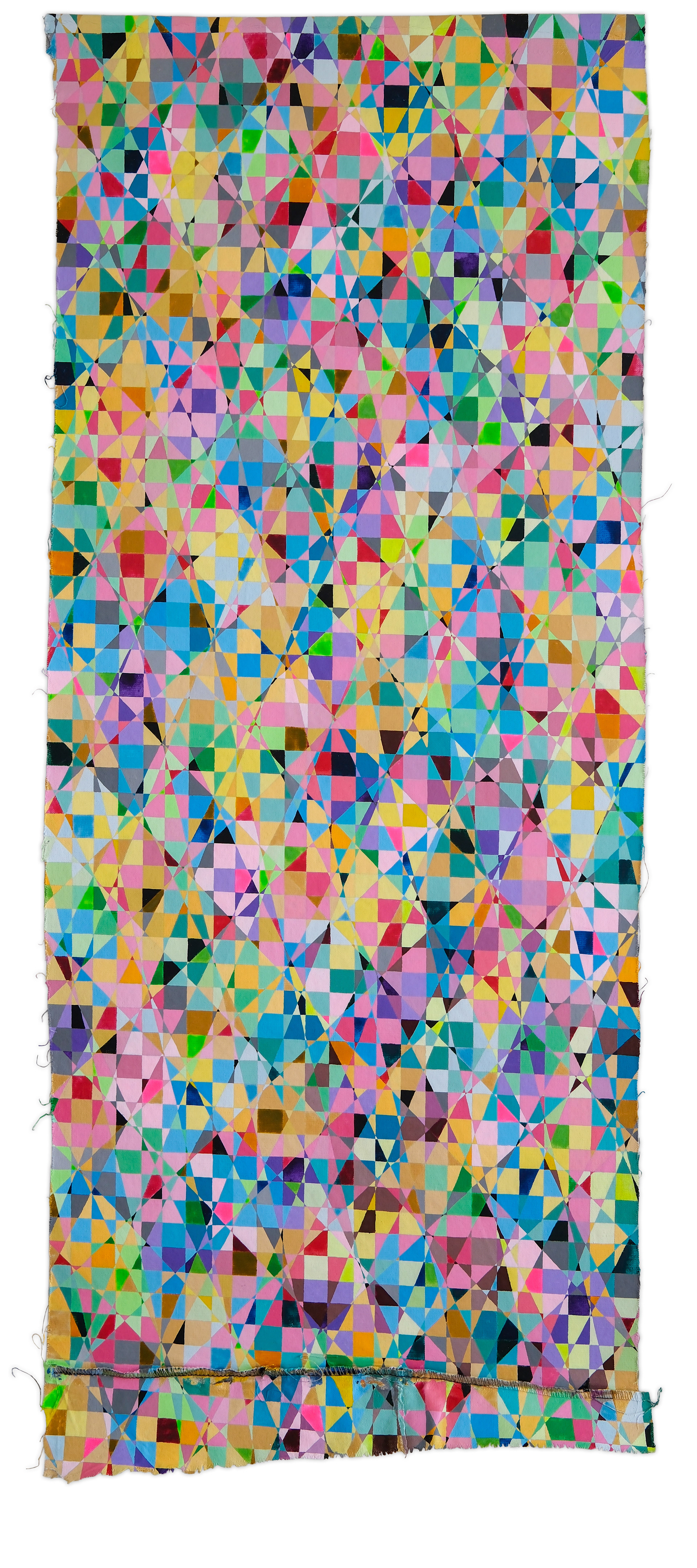 It starts with a very simple idea: intersecting lines form shapes. One base color is applied inside some of those shapes distributed across the canvas. I then add some white to the base color and paint only the surrounding shapes that are connected to the initial one by a corner. And the process is repeated again with an even lighter color. There are some more rules: